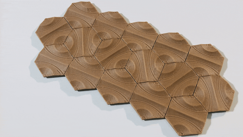 The modules embed magnets to create a self-guided assembly system. The finished puzzle precisely holds together even on a vertical facade, showcasing the user's design as an extendable, reconfigurable decoration.