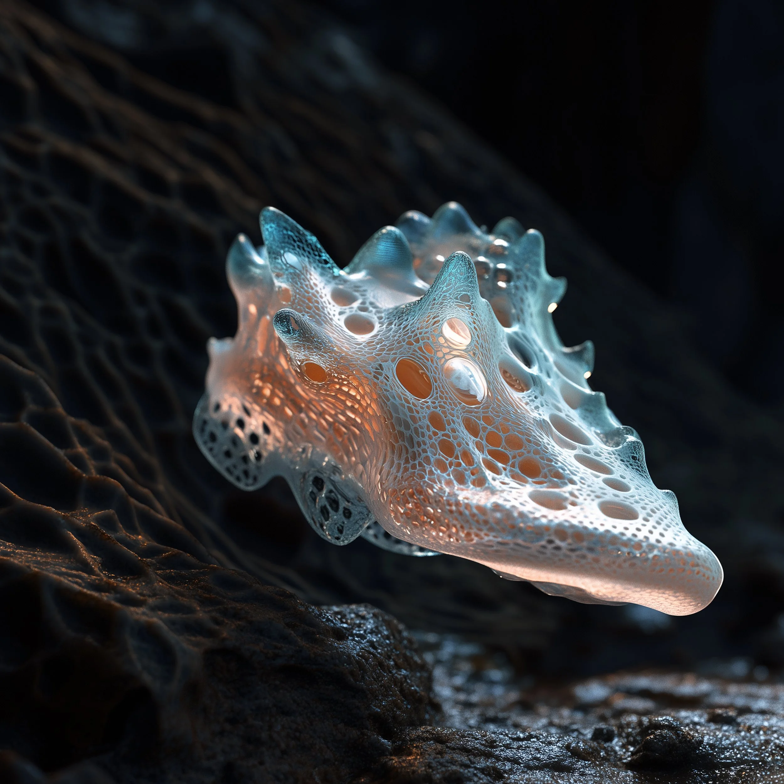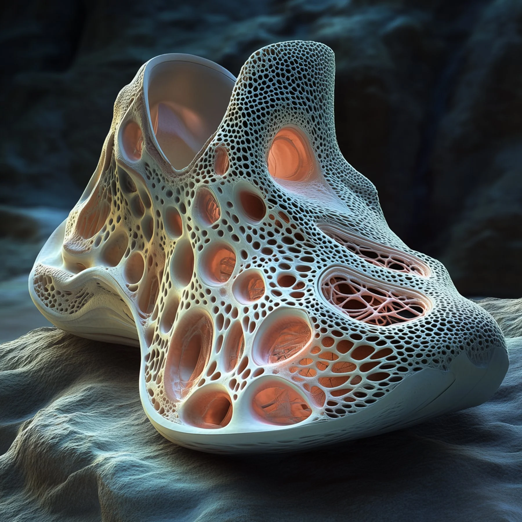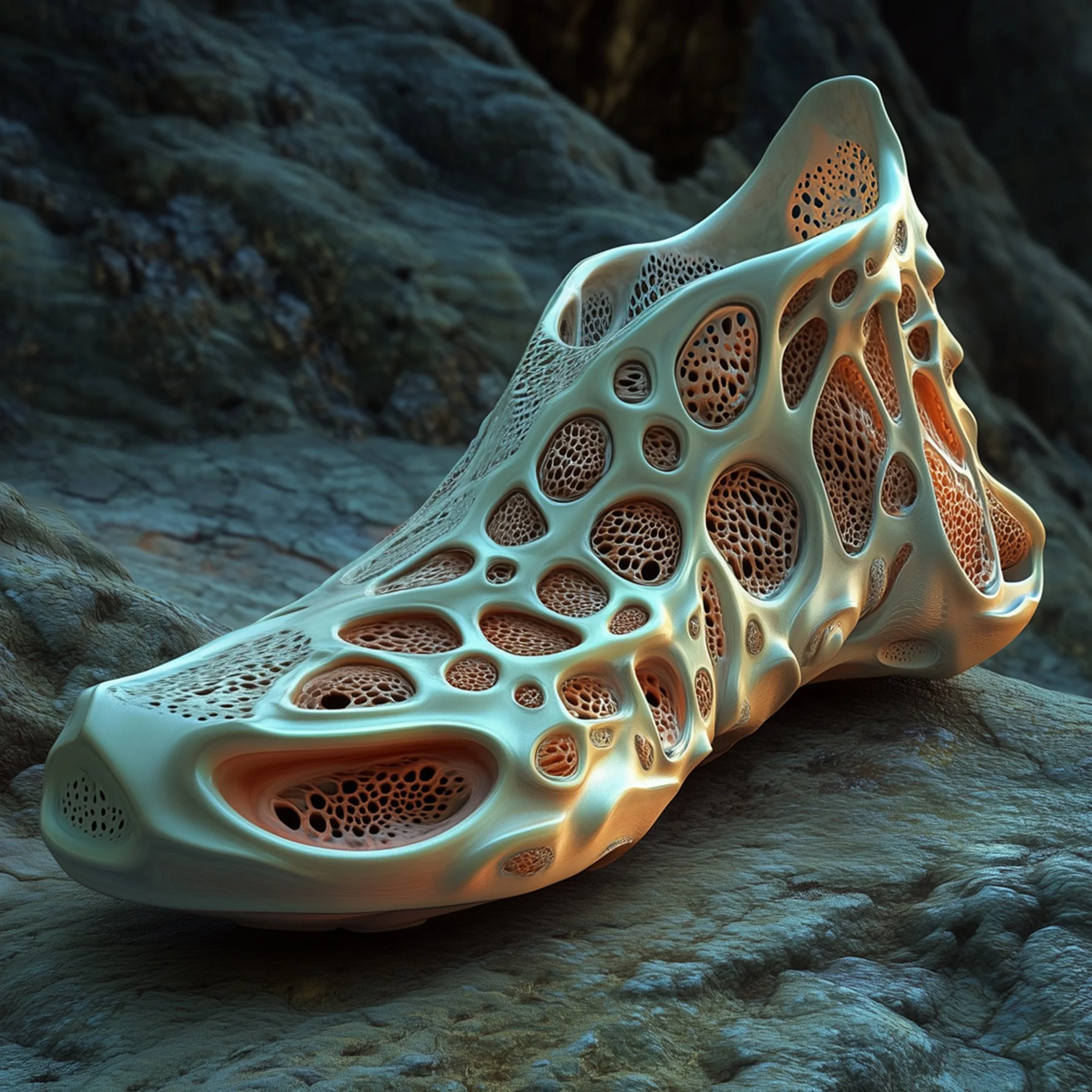 The footwear is realized through generative design workflows, integrating biomimetic simulations, 3D-printed bio-composites, and mycelium-based biodegradable polymers. The parametric structure optimizes breathability, structural performance, and lightweight flexibility. The material composition includes seaweed-derived bioplastics, calcium-infused lattice structures, and fungal mycelium composites, ensuring a regenerative lifecycle aligned with oceanic restoration initiatives. Computational fluid dynamics (CFD) and topological optimization refine the form’s hydrodynamic properties, enhancing its environmental synergy when repurposed as an artificial reef structure.